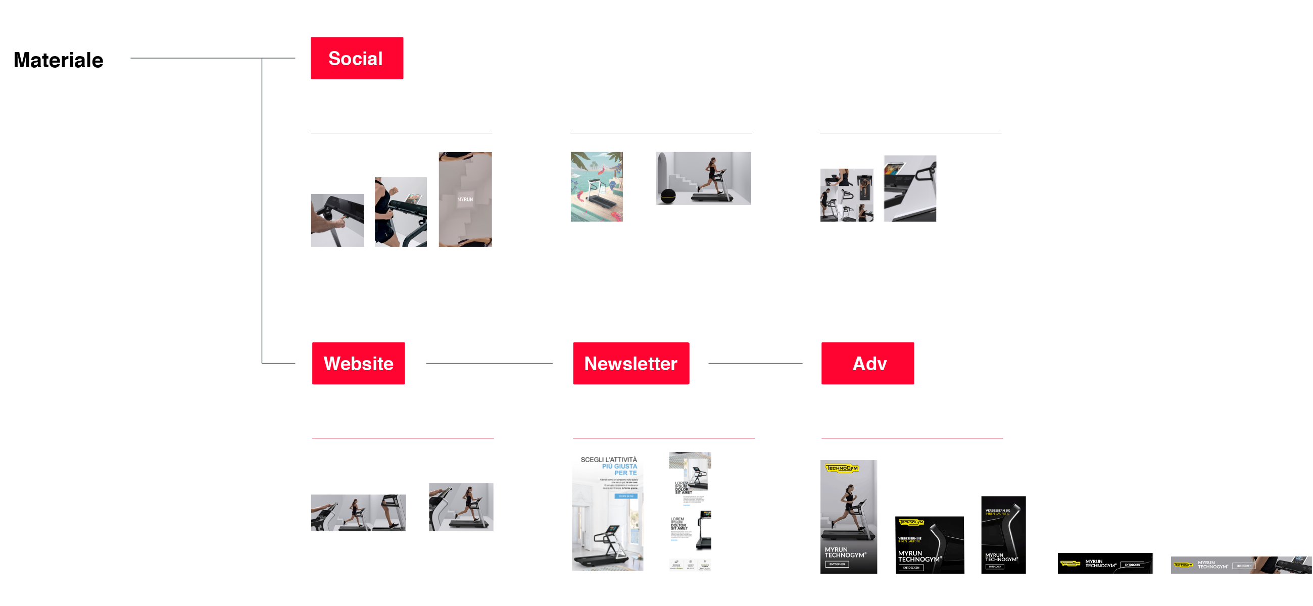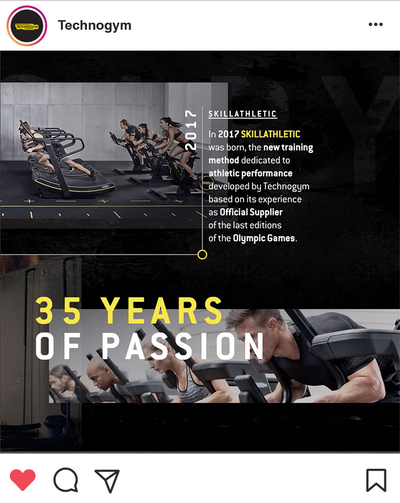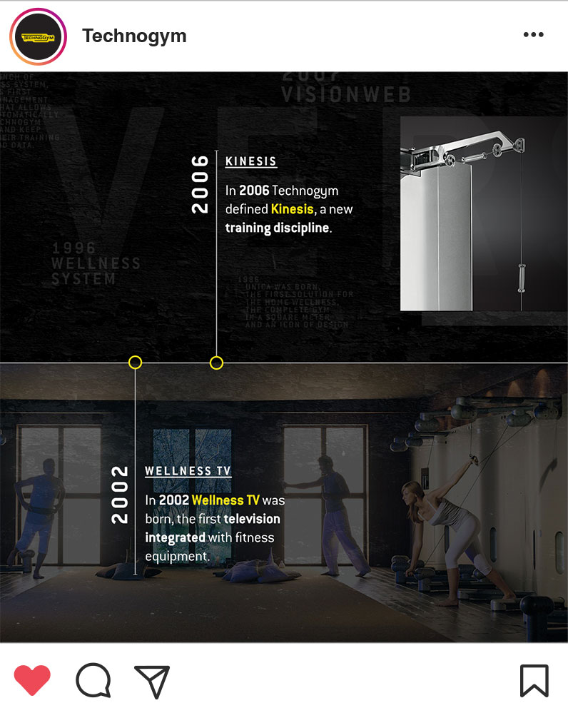 Technogym è un brand così dinamico e ricco di contenuti diversi tra loro da permetterci di diversificare molto le produzioni e le proposte creative. Lavoriamo quotidianamente per produrre ogni mese una media di 130 output video e foto da pubblicare come post, e 230 Instagram Story.